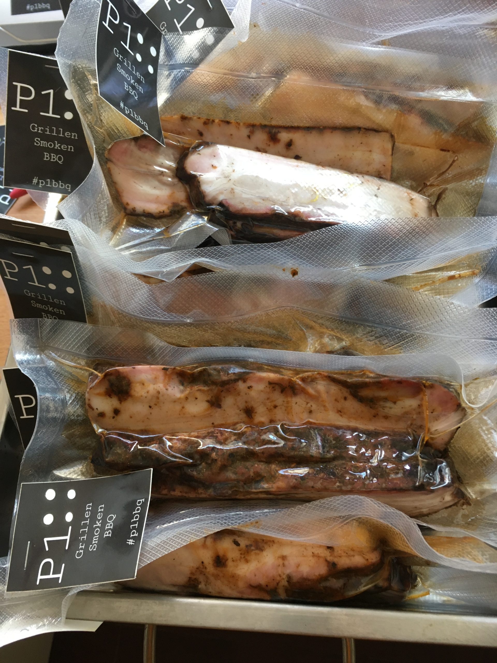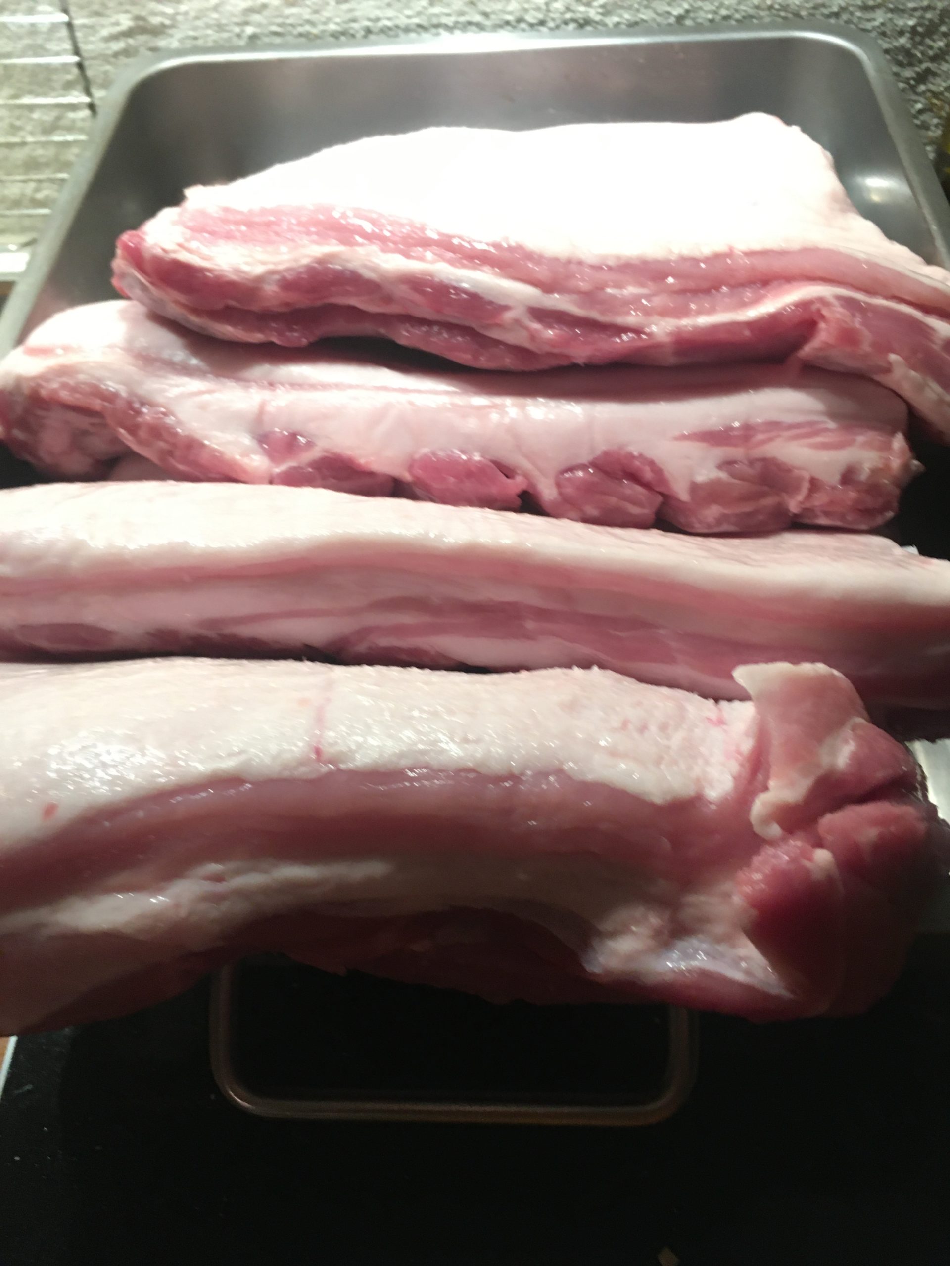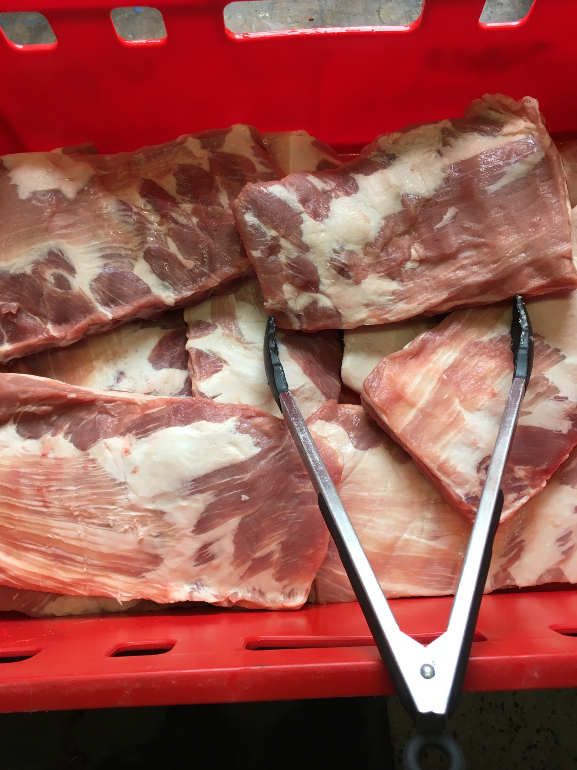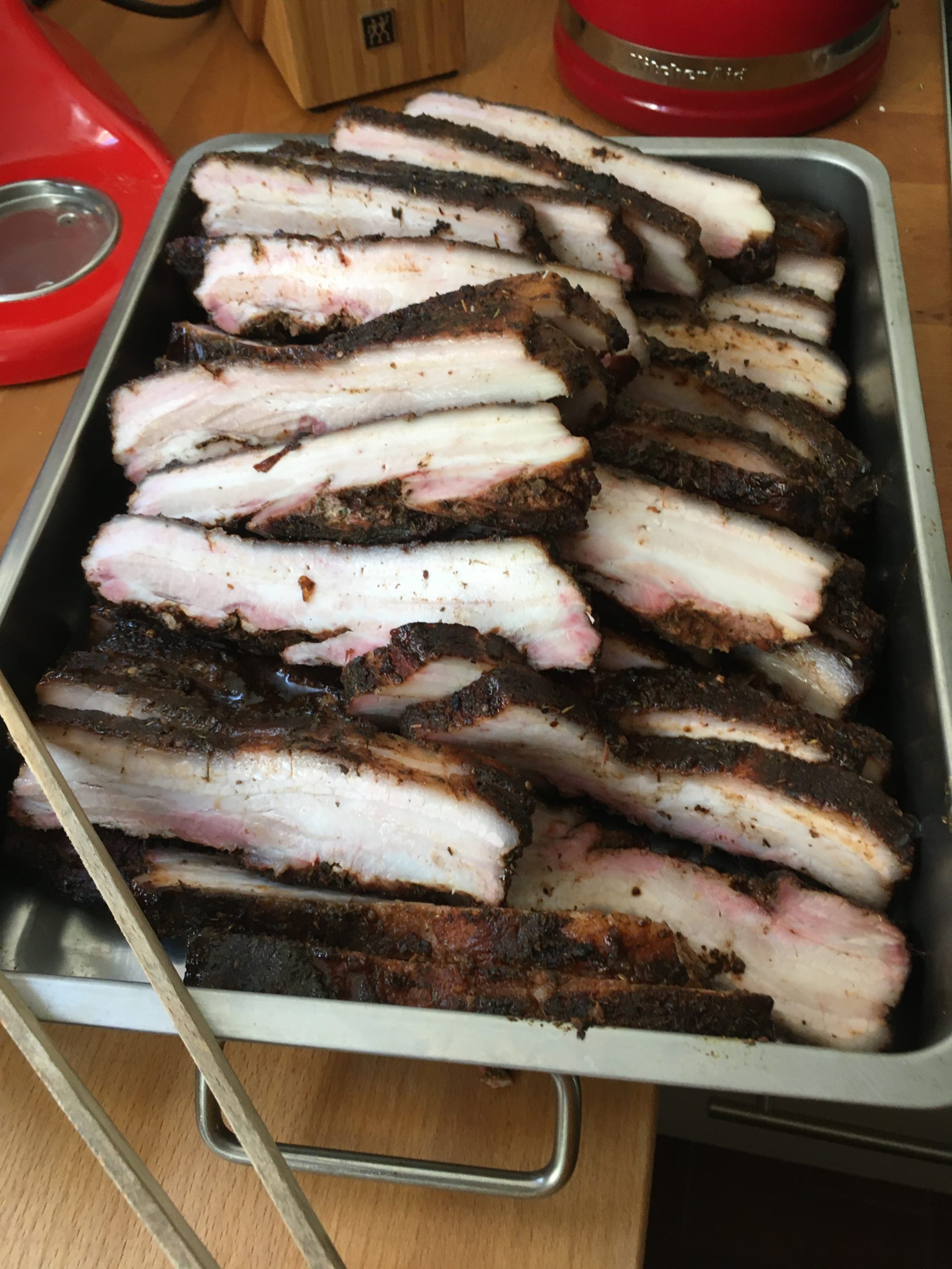 Hier wurden rund 5700 gr. Schweinebauch verarbeitet. Dieser wird über Nacht in einer Würzlake mariniert. Nach dem Abtropfen wird der Bauch mit einer eigens gemischten Würzmischung ummantelt. Vorbereitung des Smokers nimmt ca. 1,5 h in Anspruch, um auf 80° c Temperatur zu kommen. Der Bauch liegt hier nun zwischen 4 und 5 Stunden im Smoker, um eine Kerntemperatur von ca. 75° c zu erreichen. Um schonend auszukühlen, werden die Stücke in Buttcherpaper eingewickelt und in einer Kühlbox gelagert. Nachdem der Bauch abgekühlt ist, wird das erst Gewicht ermittelt, portioniert und verpackt.