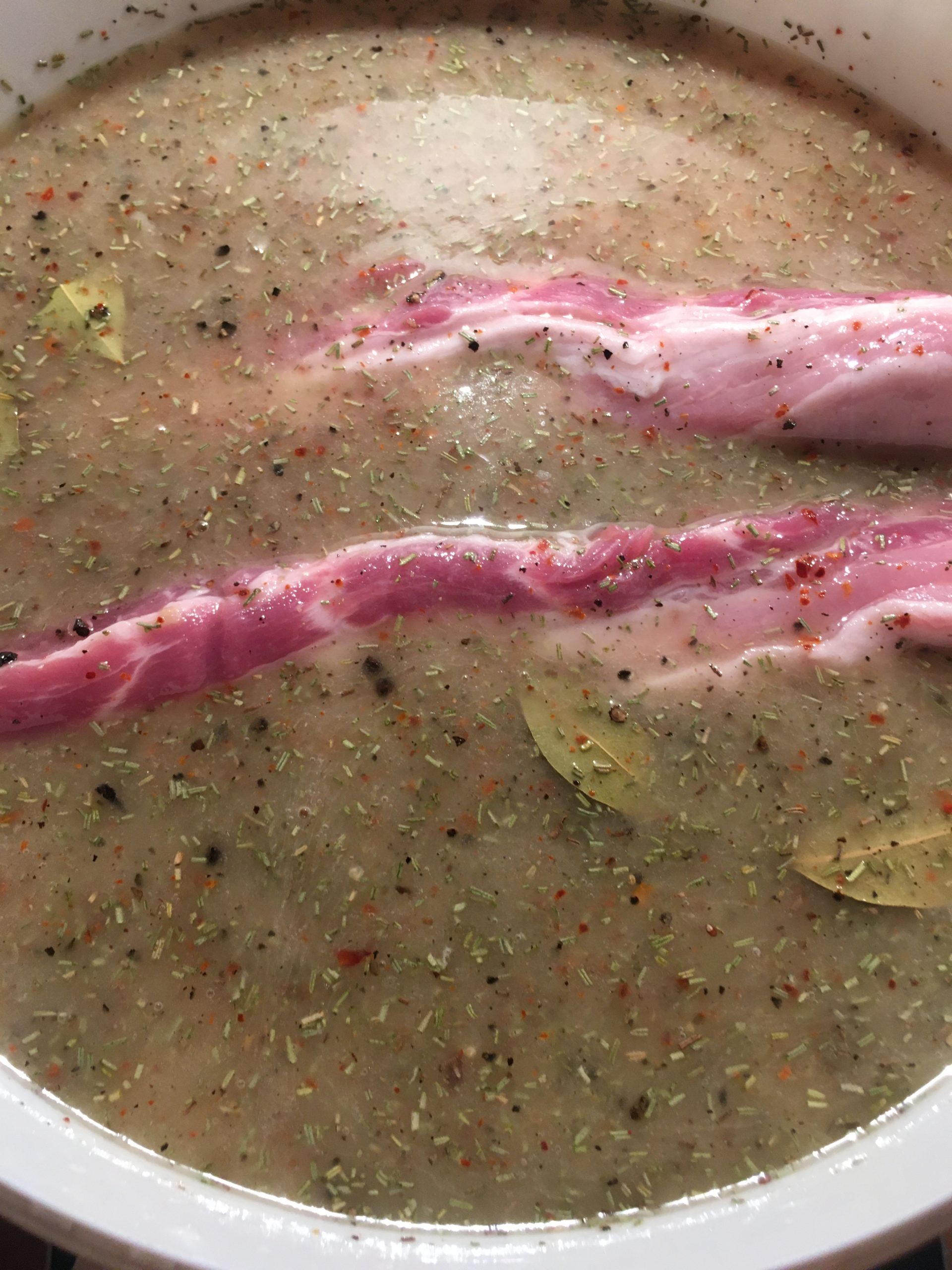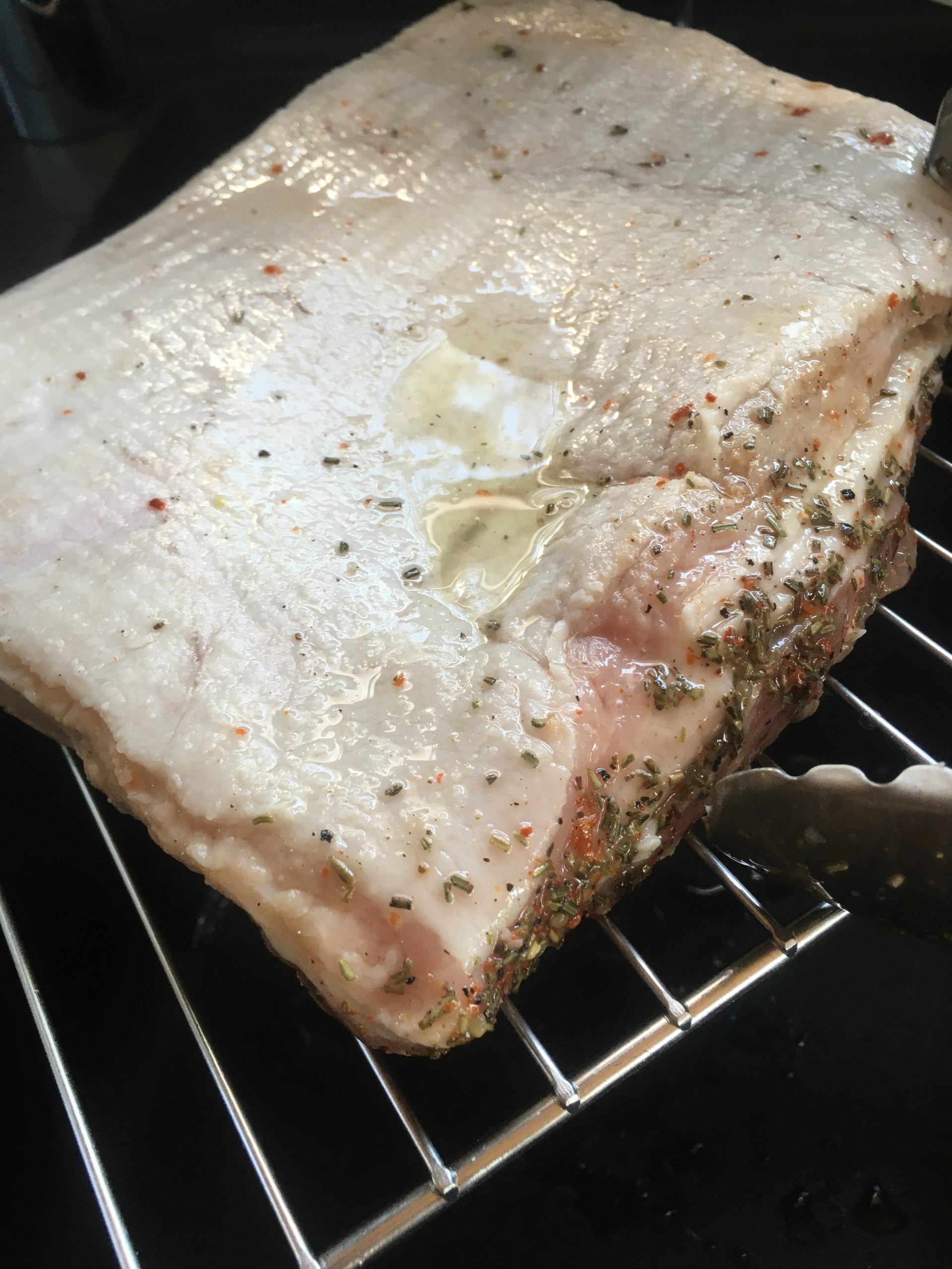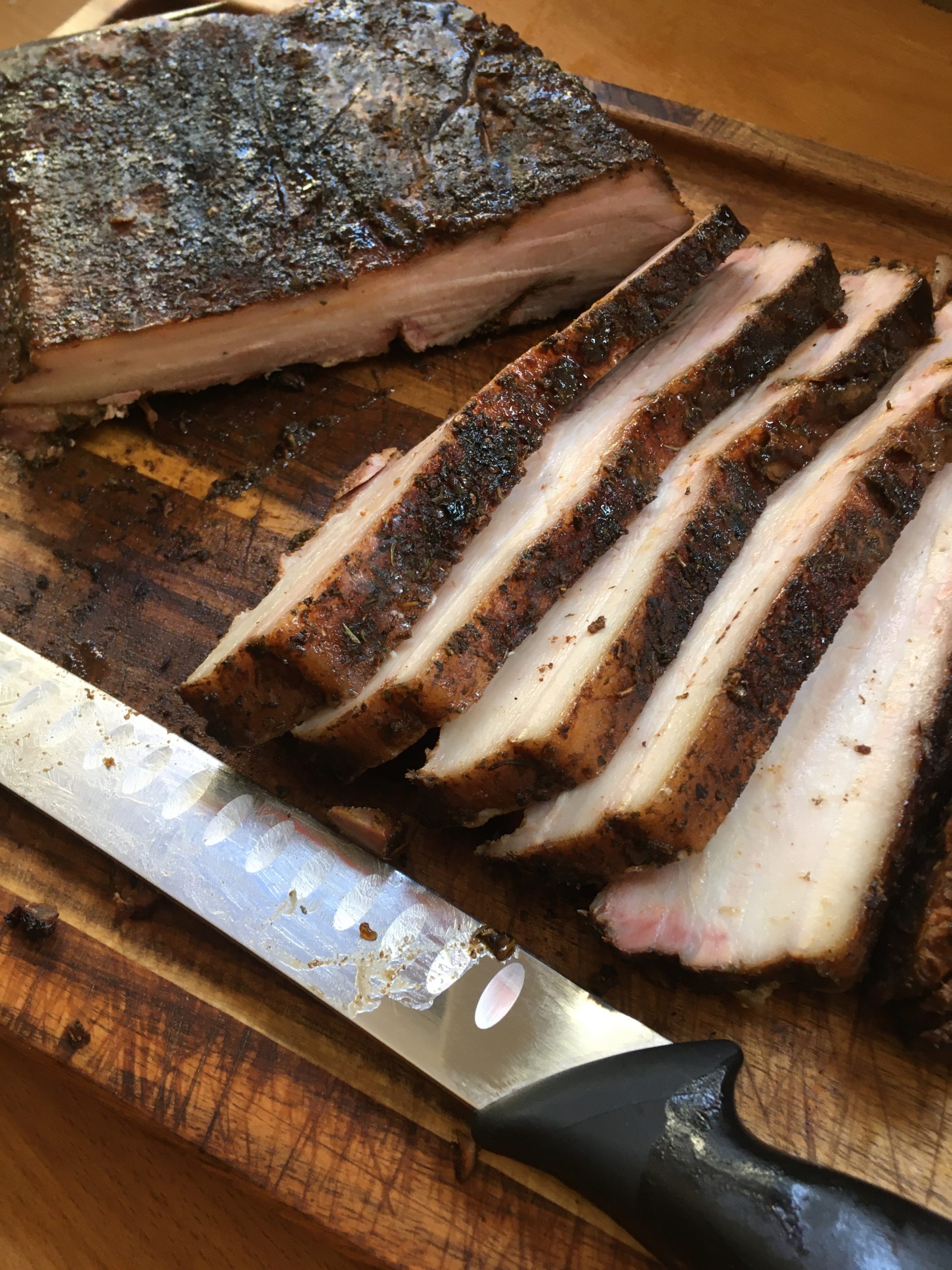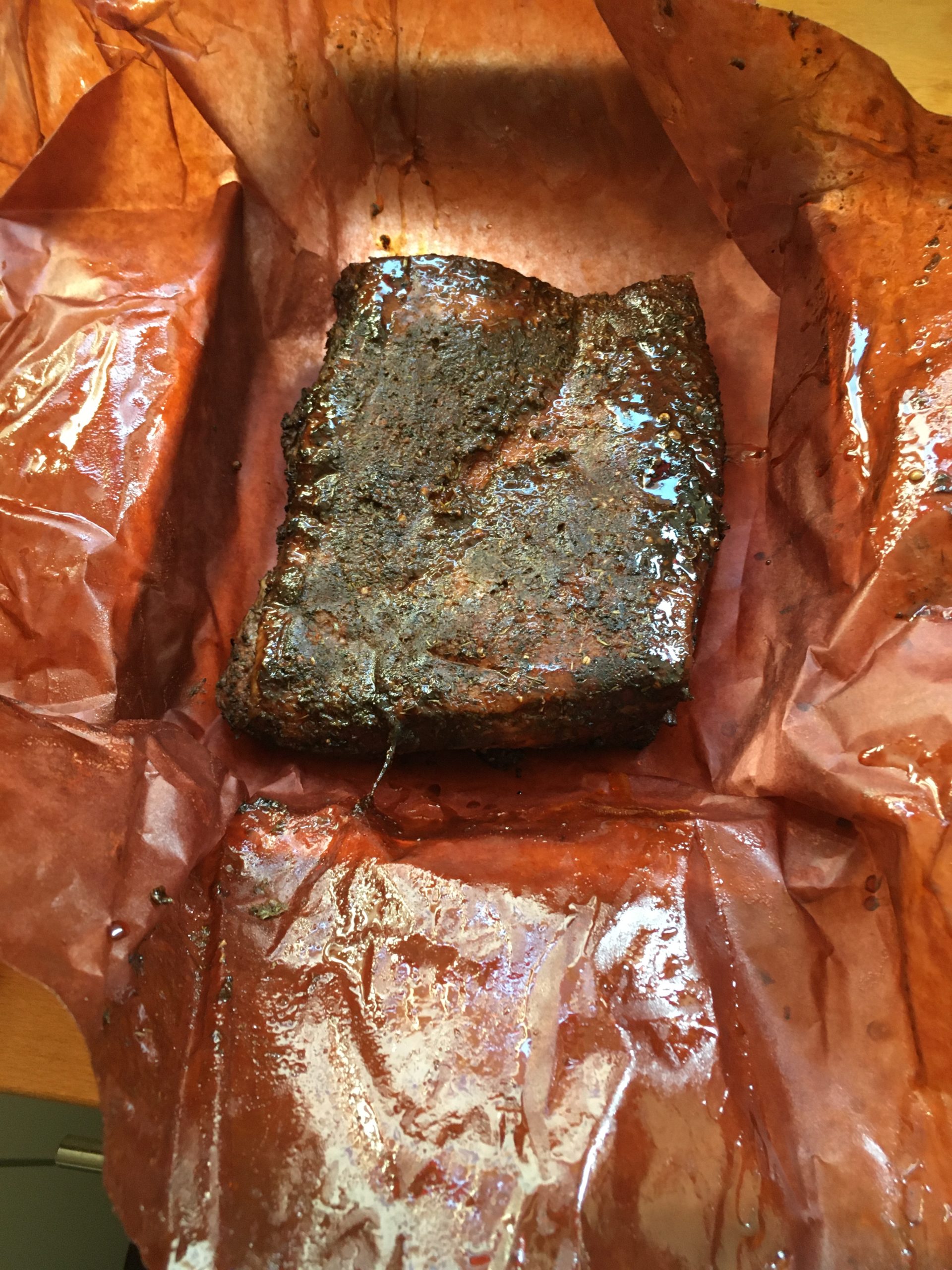 Hier wurden rund 5700 gr. Schweinebauch verarbeitet. Dieser wird über Nacht in einer Würzlake mariniert. Nach dem Abtropfen wird der Bauch mit einer eigens gemischten Würzmischung ummantelt. Vorbereitung des Smokers nimmt ca. 1,5 h in Anspruch, um auf 80° c Temperatur zu kommen. Der Bauch liegt hier nun zwischen 4 und 5 Stunden im Smoker, um eine Kerntemperatur von ca. 75° c zu erreichen. Um schonend auszukühlen, werden die Stücke in Buttcherpaper eingewickelt und in einer Kühlbox gelagert. Nachdem der Bauch abgekühlt ist, wird das erst Gewicht ermittelt, portioniert und verpackt.